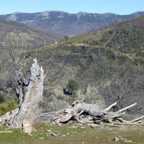 El camino está muy pisado y no tiene perdida. Desde la presa seguimos 960 metros y en un espolón rocoso abandonamos el camino con rumbo de 65º al Noreste. sorteando la abundante vegetación de jaras. Entre medias se puede ver trazas de camino y algún hito aislado. Es de ascenso que no da tregua. En apenas 920 metros de distancia y 180 metros de desnivel llegamos a la pista que recorre el circo.